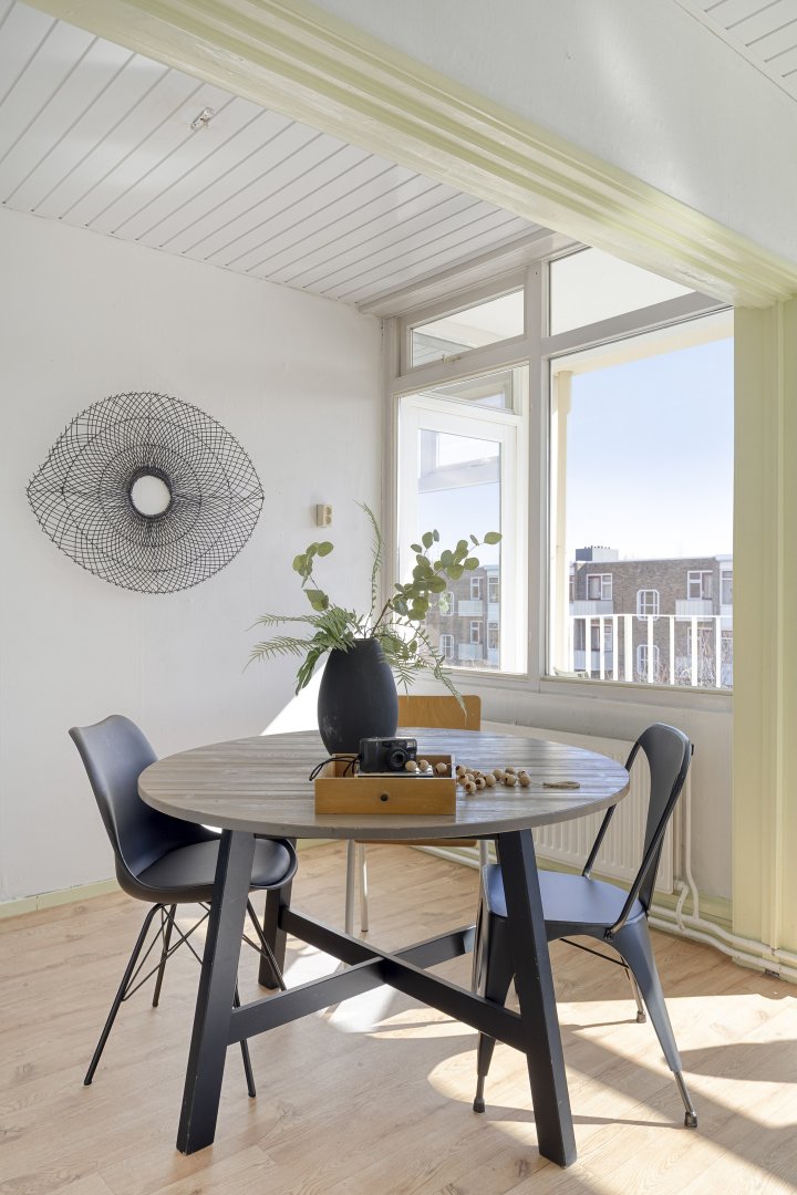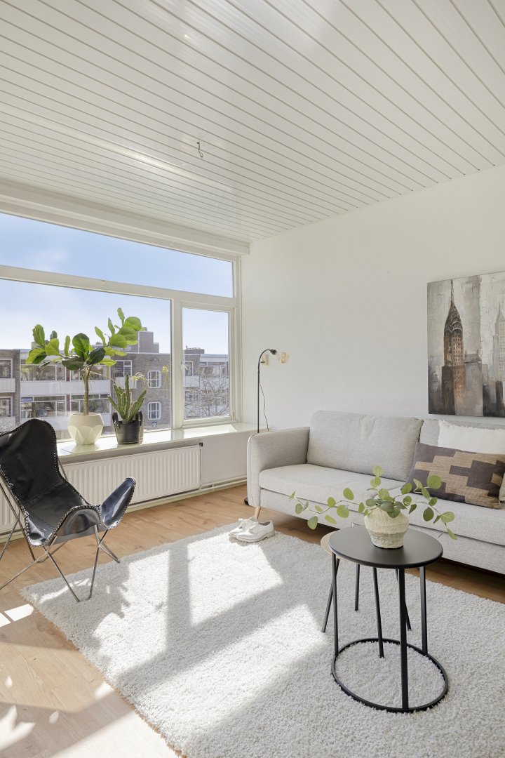 Vanuit de hal zijn de keuken, het toilet, de badkamer, de woonkamer en twee slaapkamers bereikbaar. De woonkamer is ruim opgezet en kenmerkt zich door de grote raampartijen, waardoor er veel natuurlijk licht binnenvalt. Er is voldoende ruimte voor zowel een zit- als eethoek. Vanuit de woon- en eerste slaapkamer is het balkon bereikbaar, gelegen op het zuiden, wat zorgt voor een prettige en zonnige buitenruimte.