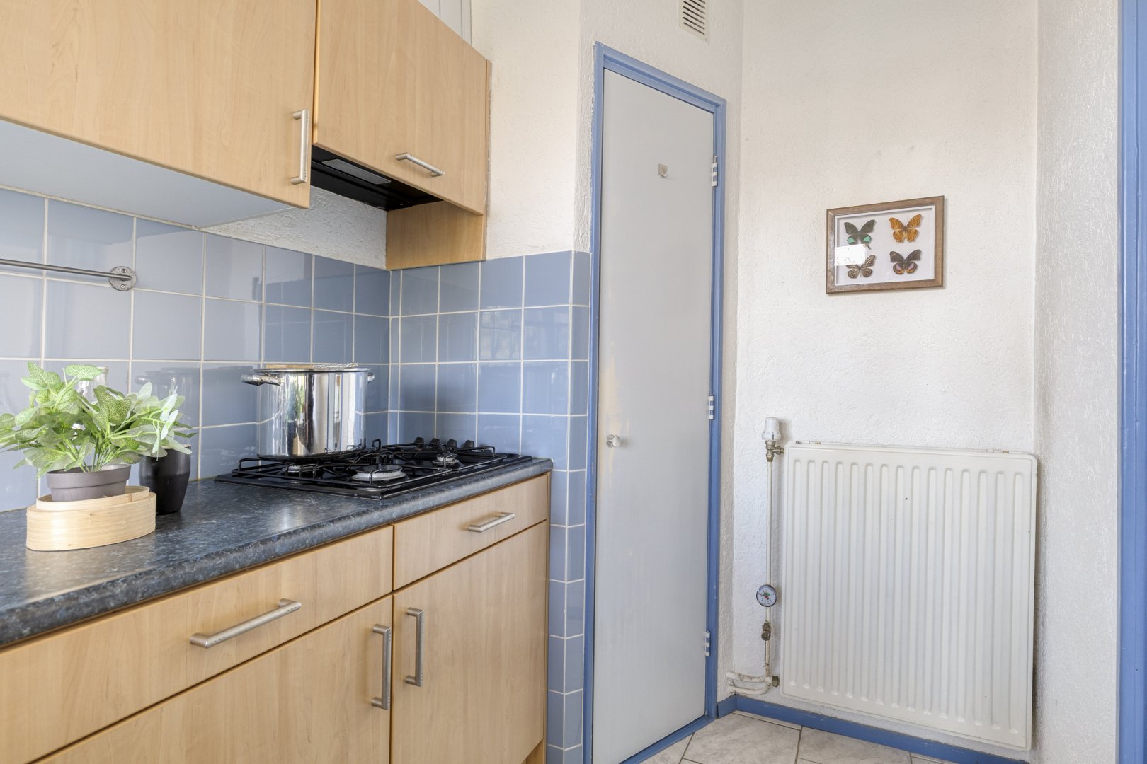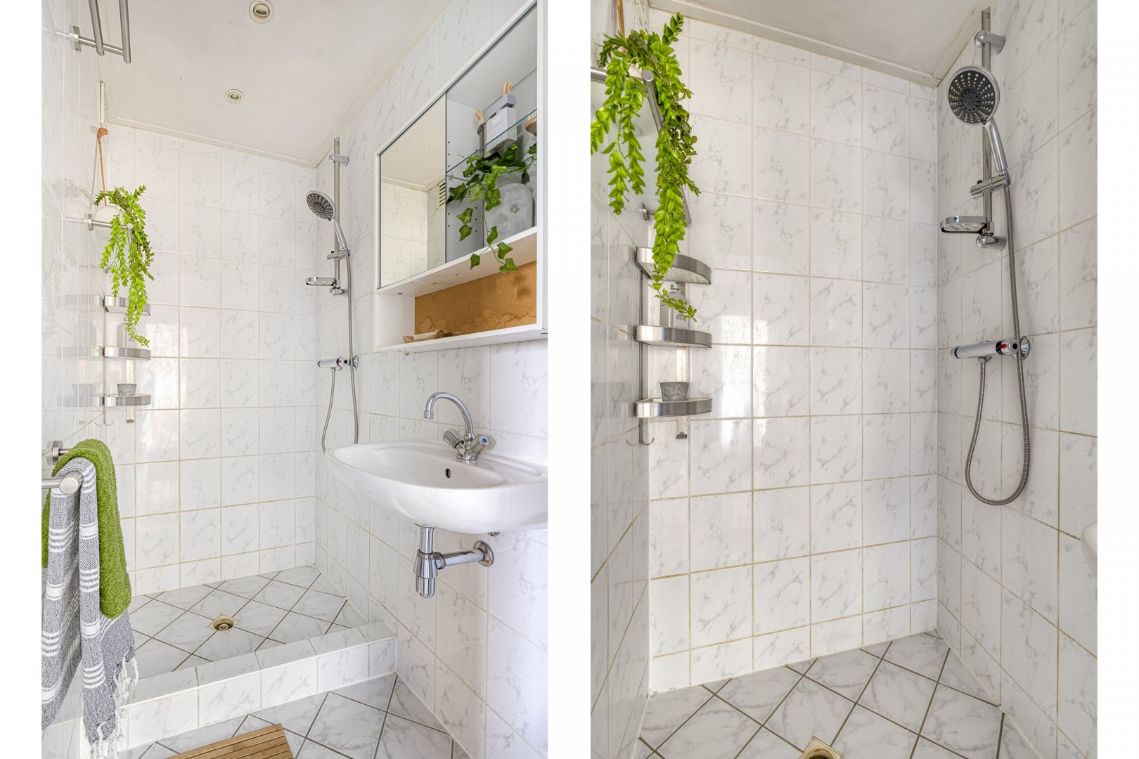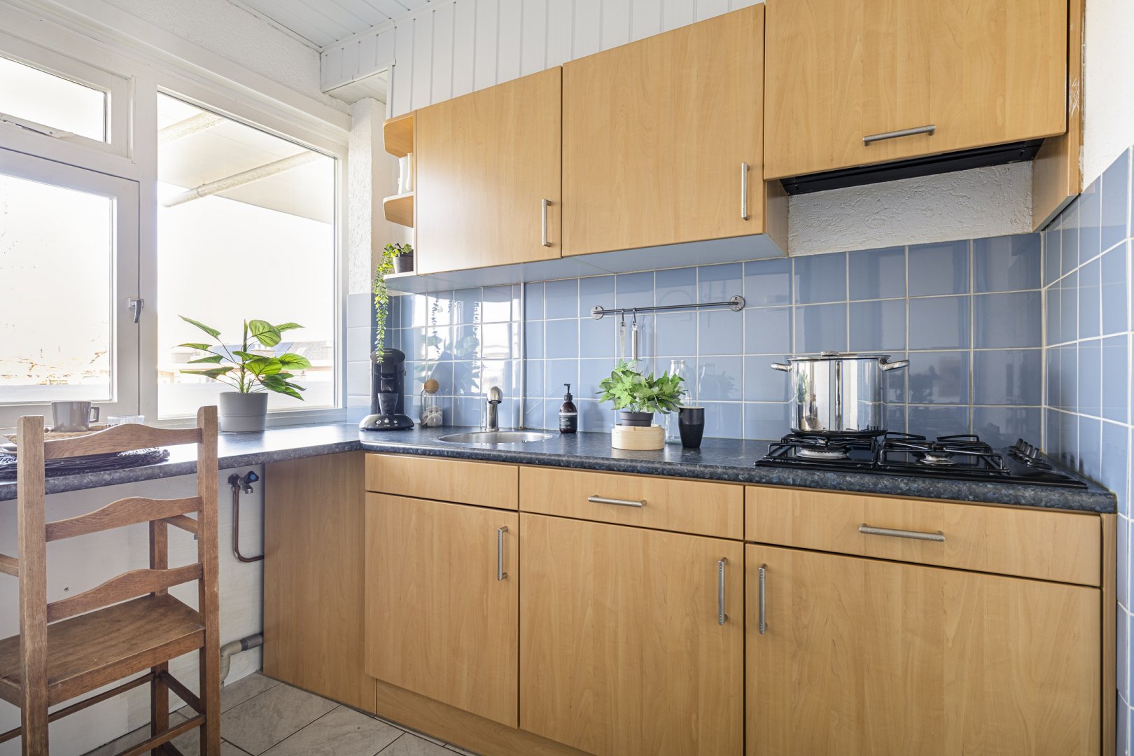 De keuken is separaat gesitueerd en praktisch ingericht met een kast voor de cv-ketel. Daarnaast beschikt de woning over een badkamer die is voorzien van een douche en een wastafel en in de hal bevindt zich een separaat toilet.